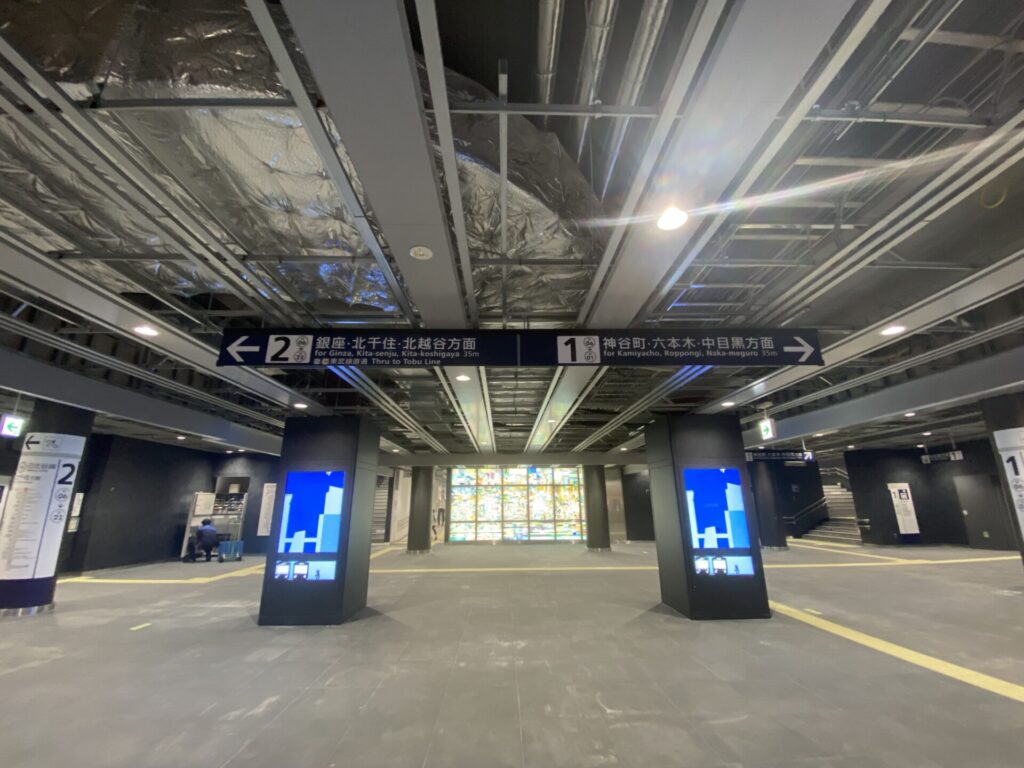 また駅改札前には大型ディスプレイが設置され、広告などの情報発信がされており、今までの東京メトロの駅にはなかったデザインや取り組みが行われています。