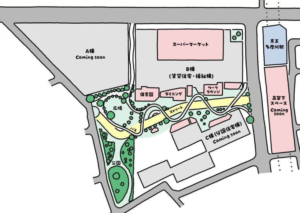 | 建物の用途 | A棟:未定 B棟 1階:スーパー・保育園・店舗・ワークラウンジ 2階:調布市総合福祉センター 3階:調布市医療ステーション 3階〜10階:賃貸マンション(214戸) C棟:分譲マンション(264戸) その他:公園・道路の新設 |